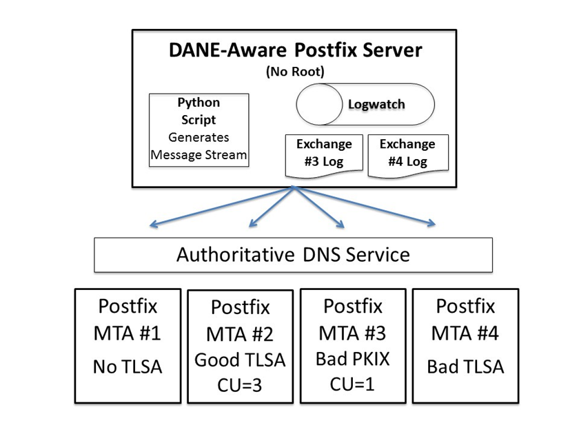 The laboratory architecture for the project was designed to permit interconnection of Microsoft Outlook, Apple Mail, and Thunderbird MUAs with Microsoft Exchange and Postfix/Dovecot MTAs. It demonstrates the interconnection of either MTA with various DNS services contributed by collaborators. Two instantiations of each MTA type were established to demonstrate email exchanges between MTAs of the same type or different types. The various component combinations were demonstrated with three different TLSA RR [5] parameters: a self-signed certificate, use of local certificate authorities, and use of well-known certificate authorities.