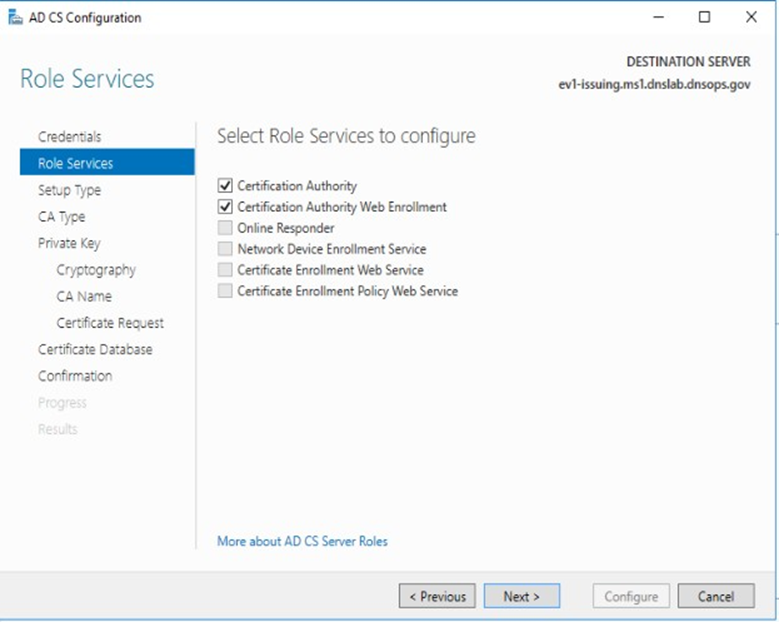 Features = Certification Authority and Certification Authority Web Enrollment (this will add the required IIS features).