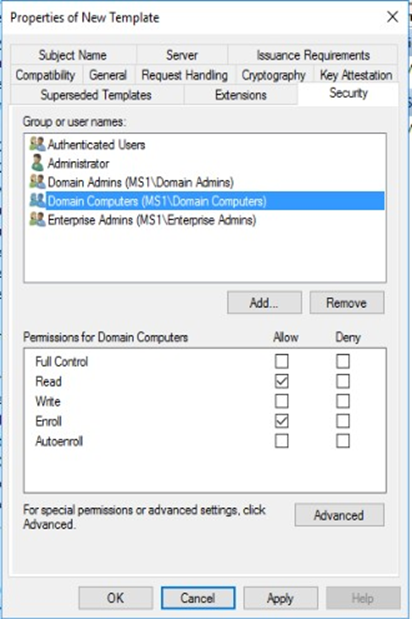 In the Security tab, select Authenticated Users from Group or user names, and allow Read and Enroll.