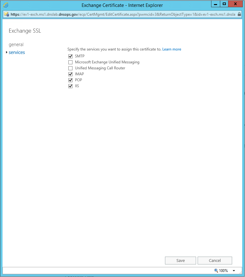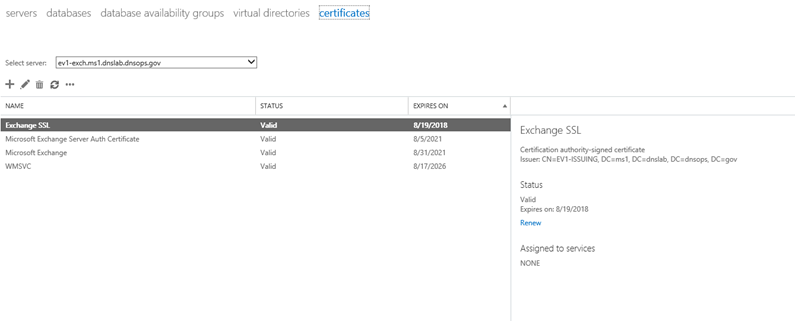 Within the Exchange Admin console (https://ev1-exch.ms1.dnslab.dnsops.gov/ECP), select Server -> Certificates, then change all services to use the issued SSL certificate.