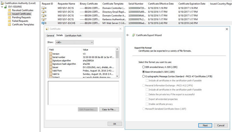 Export the Exchange SSL certificate to a .cer file. Find the certificate on the Issuing CA (ev1-issuing) within the Issued Certificates group.
