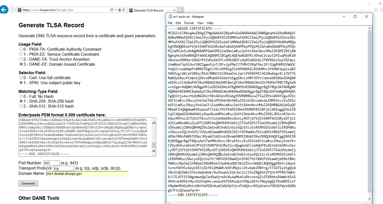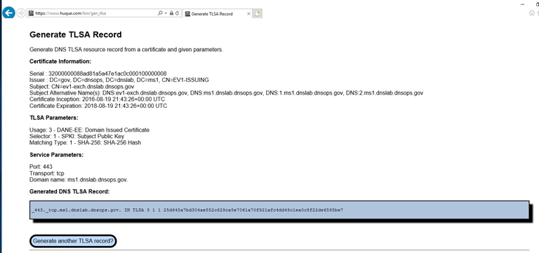 add-dnsserverresourcerecord -TLSA -CertificateAssociationData "25d645a7bd304ae552c629ca5e7061a70f921afc4dd49c1ea0c8f22de6595be7" - CertificateUsage DomainIssuedCertificate -MatchingType Sha256Hash -Selector FullCertificate -ZoneName ms1.dnslab.dnsops.gov -Name _25._tcp.ev1- exch.ms1.dnslab.dnsops.gov.