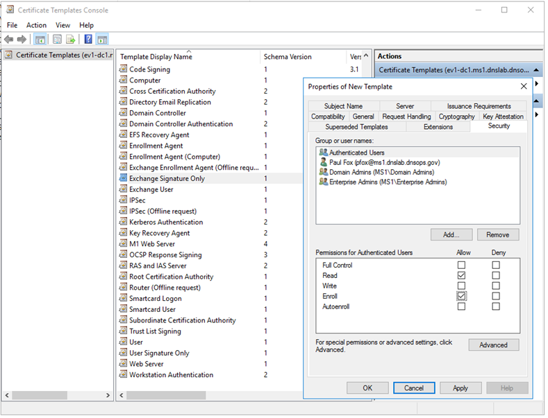 Subject Name: Common Name = ev1-exch.ms1.dnslab.dnsops.gov