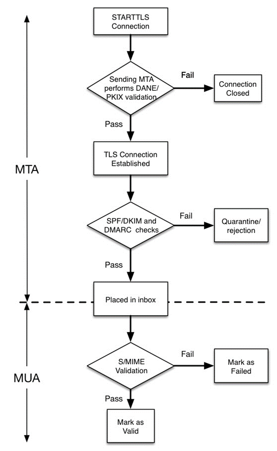 “ordinary” email where the email exchanges between two organizations’ email servers communicate over Transport Layer Security (TLS) [3] with a STARTTLS [4] extension, and relevant TLSA [5] records are published in the receiver’s DNS zone protected by DNSSEC (Scenario 1 in this document)